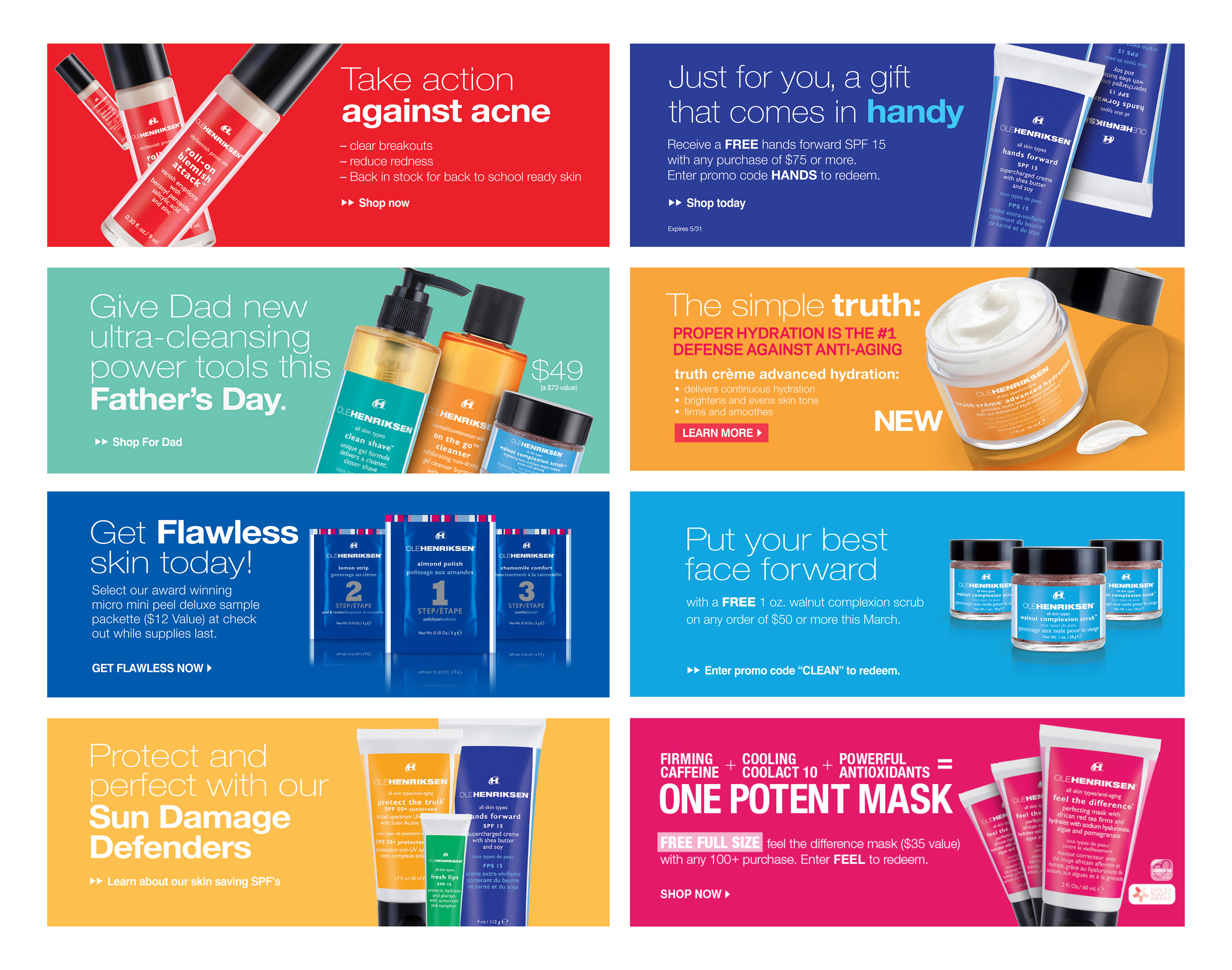 I worked with OLEHENRIKSEN from 2011-2014 on a wide range of projects that covered packaging, in-store signage, displays, eblast and much more. The following is just a small sampling of the work.