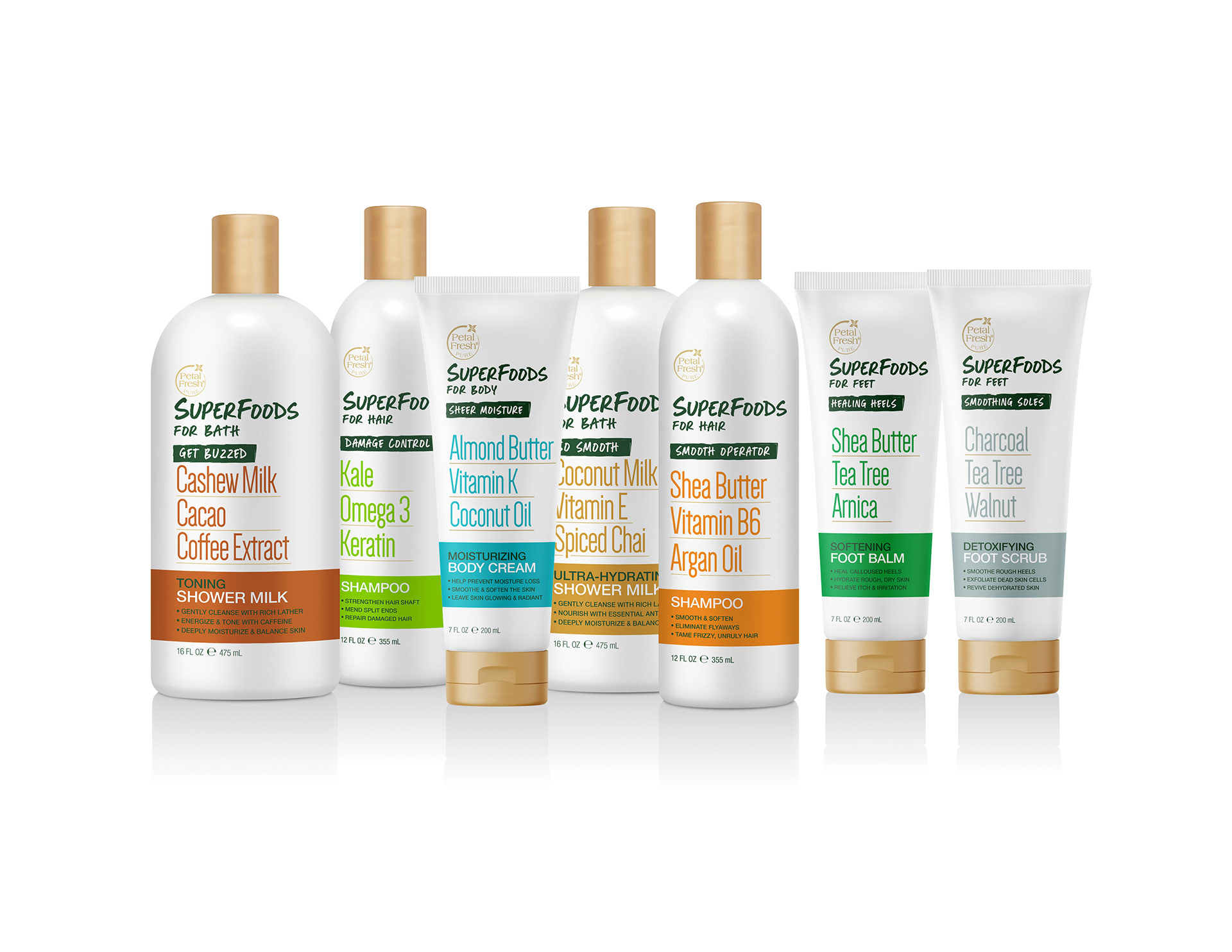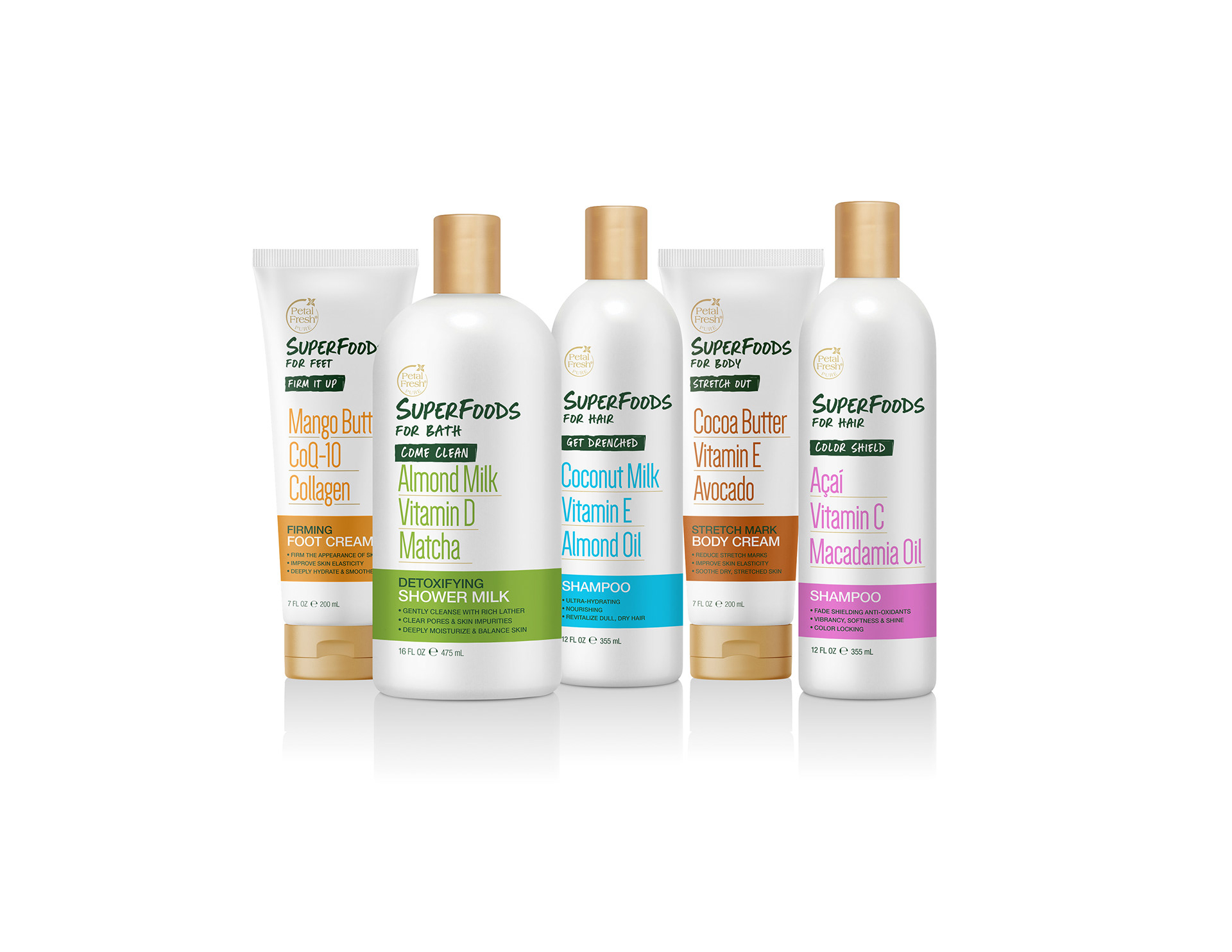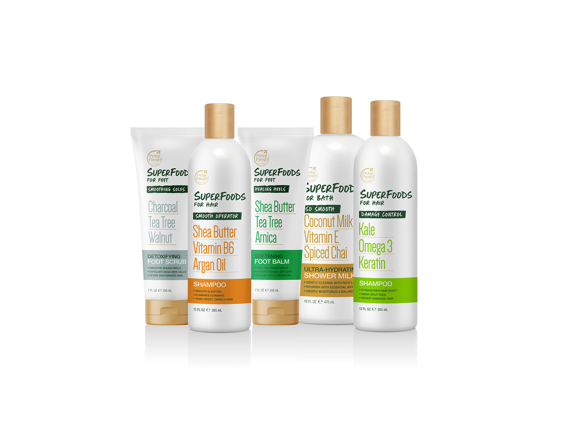Petal Fresh Pure needed a line extension that could capture a growing consumer segment: shoppers gravitating toward food-forward beauty, where ingredients you recognize from the kitchen carry real credibility on the shelf. I was tasked with developing a cohesive packaging system across four sub-categories -- Hair, Body, Bath, and Feet -- while making on-trend superfoods and functional supplements the clear hero of every SKU.